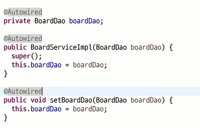 생성자를 사용하는 방법임. // 주입된 boardService 객체의 변경 방지를 위해 final 처리한다.