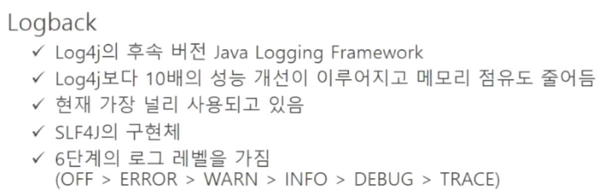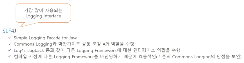 개발자는 slf4j 인터페이스에 맞춰 로그 작업을 하고 slf4j는 실제로 동작할 로깅 프레임워크(log4j, logback 등)을 연결한다. (다양한 로깅 프레임워크가 있지만 사용법을 통일하기 위해 slf4j 인터페이스를 사용한다. 개발자는 slf4j와만 작업하기 때문에 그 뒷단 하나하나 문법은 신경안써도 된다)
