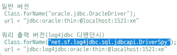 Class.forName("net.sf.log4jdbc.sql.jdbcapi.DriverSpy"); // oracle jdbc 로드
