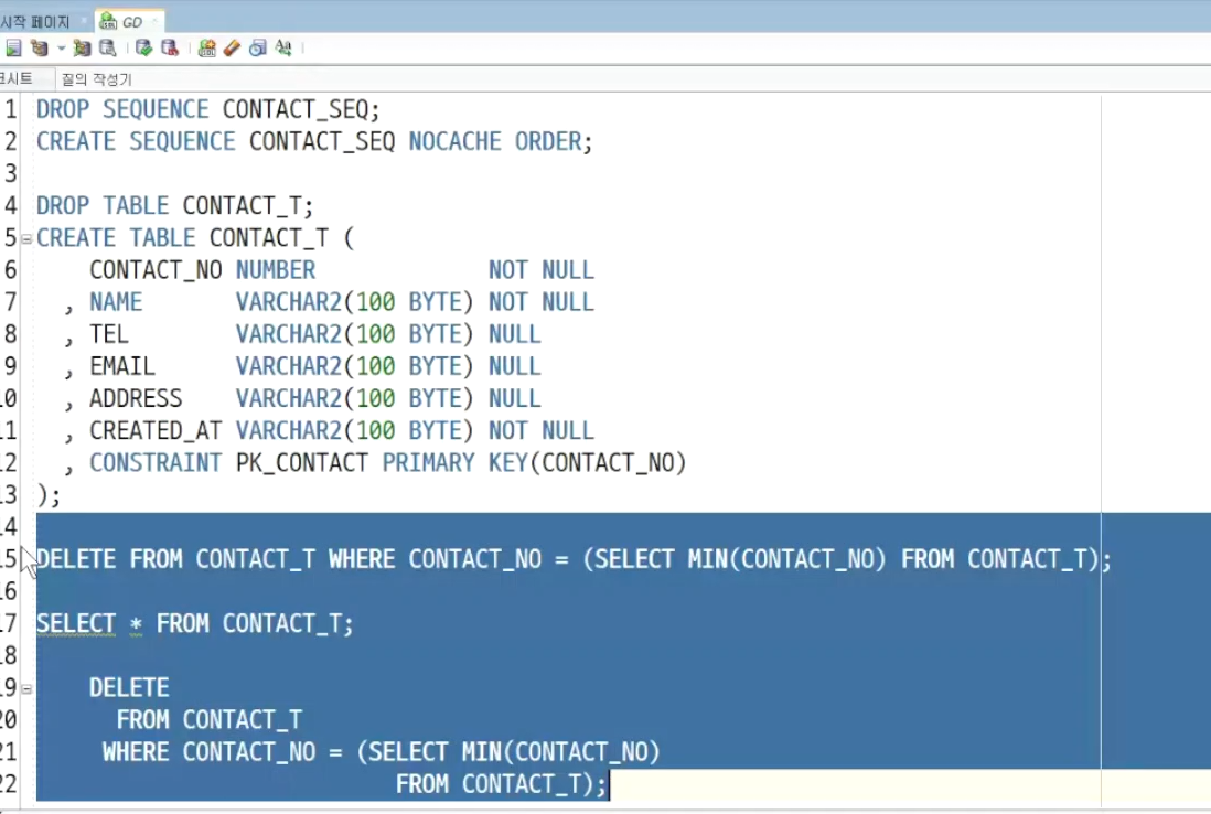 DELETE FROM CONTACT_T WHERE CONTACT_NO = (SELECT MIN(CONTACT_NO) FROM CONTACT_T);