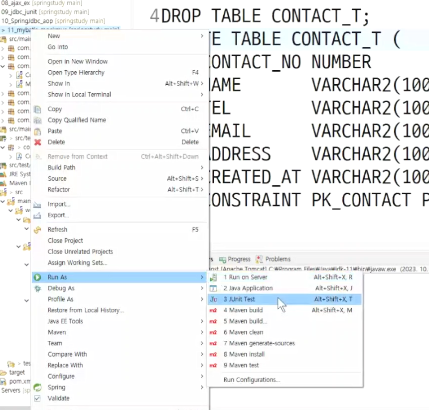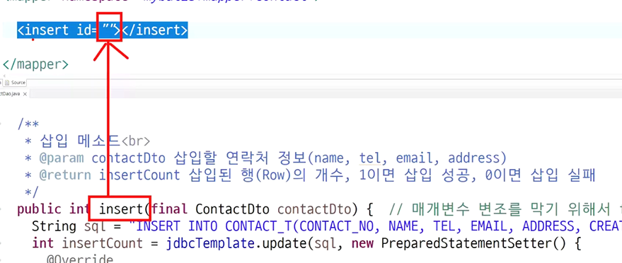사실상 컨택매퍼 인터페이스랑 컨택매퍼 xml은 하나인데 xml에 있는 걸 직접 부를수는 없으니 인터페이스를 사용하는 것. 인터페이스를 부르면 똑같은 이름을 가진 아이디를 찾아서 호출