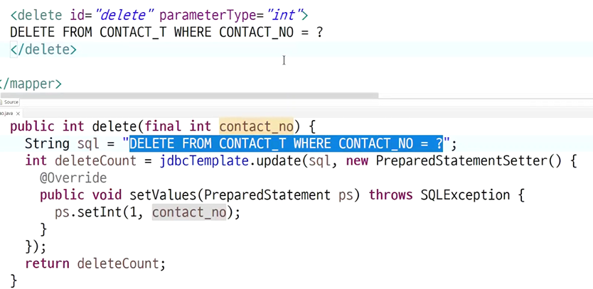 String sql = "DELETE FROM CONTACT_T WHERE CONTACT_NO = ?";