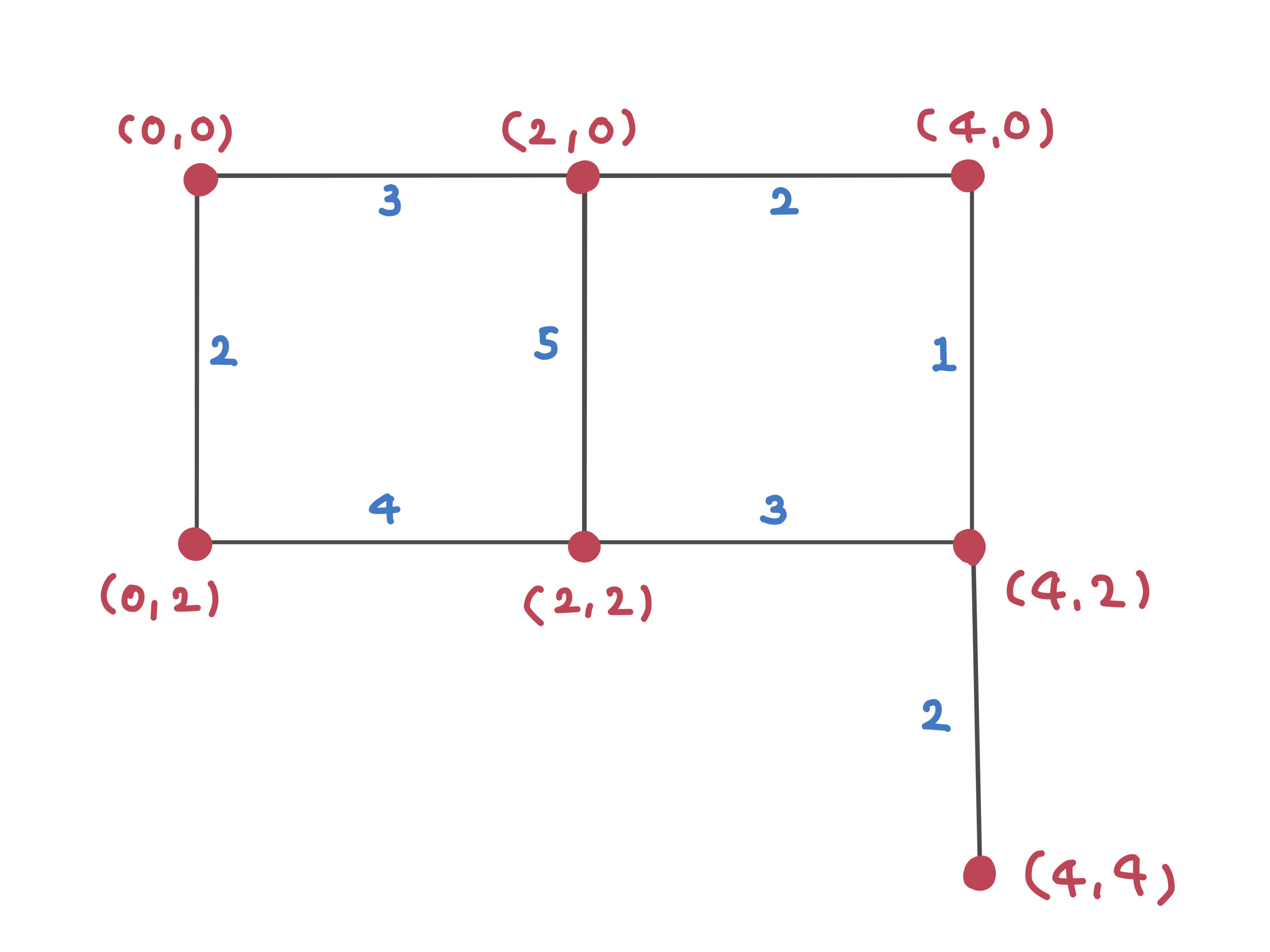 pair<vector<pair<int, int>>, double> 으로 최단 경로와 총 가중치를 반환한다. 최단 경로를 vector로 저장하는 것은, 경로상의 각 노드 pair<int, int>들을 순서대로 저장할 수 있기 때문.unordered_map<pair<int, int>, vector<pair<pair<int, int>, int>>, hash_pair>& graphunordered_map을 사용하여 노드마다 연결된 인접 노드와 가중치 저장pair<int, int> : 노드의 좌표vector<pair<pair<int, int>, int>> : 인접 노드의 좌표와 그 간선의 가중치const의 의미 : 상수성const를 붙이면 함수 내부에서 해당 매개변수를 변경할 수 없음을 의미 (즉, 읽기 전용)const를 사용함으로써 함수 내에서 graph가 수정되는 실수를 방지&의 의미 : 참조자&를 사용하면, 해당 매개변수를 참조로 전달(pass by reference)하게 됨. 즉, 객체의 복사본을 생성하지 않고 원래 객체를 참조하여 사용함.unordered_map과 같이 큰 객체를 값으로 전달하면 객체의 복사본이 생성되며, 메모리와 시간을 많이 소모하게 됨. &를 사용하면 복사 없이 원본 객체를 참조하므로 성능이 향상되고 메모리 사용량을 절약할 수 있음. unordered_map<pair<int, int>, double, hash_pair> g_costs;