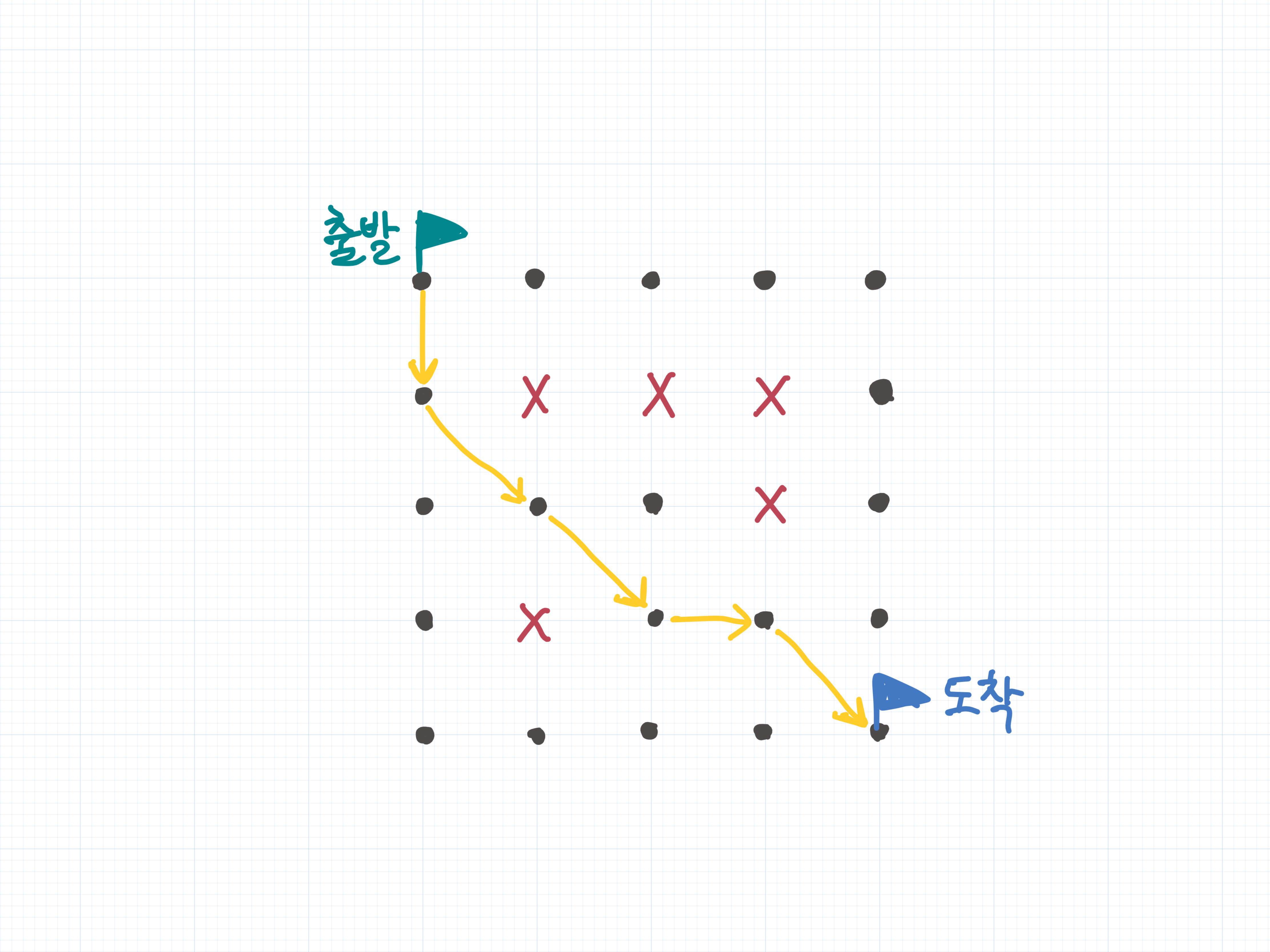출발점 -> (1, 0): 수직 이동(1, 0) -> (2, 1) : 대각선 이동 (장애물 (1, 1) 회피)(2, 1) -> (3, 2) : 대각선 이동(3, 2) -> (3, 3) : 수평 이동(3, 3) -> (4, 4) : 대각선 이동처음에 나왔던 최단 경로가 맞았다... (1차 2차 수정 왜함?)