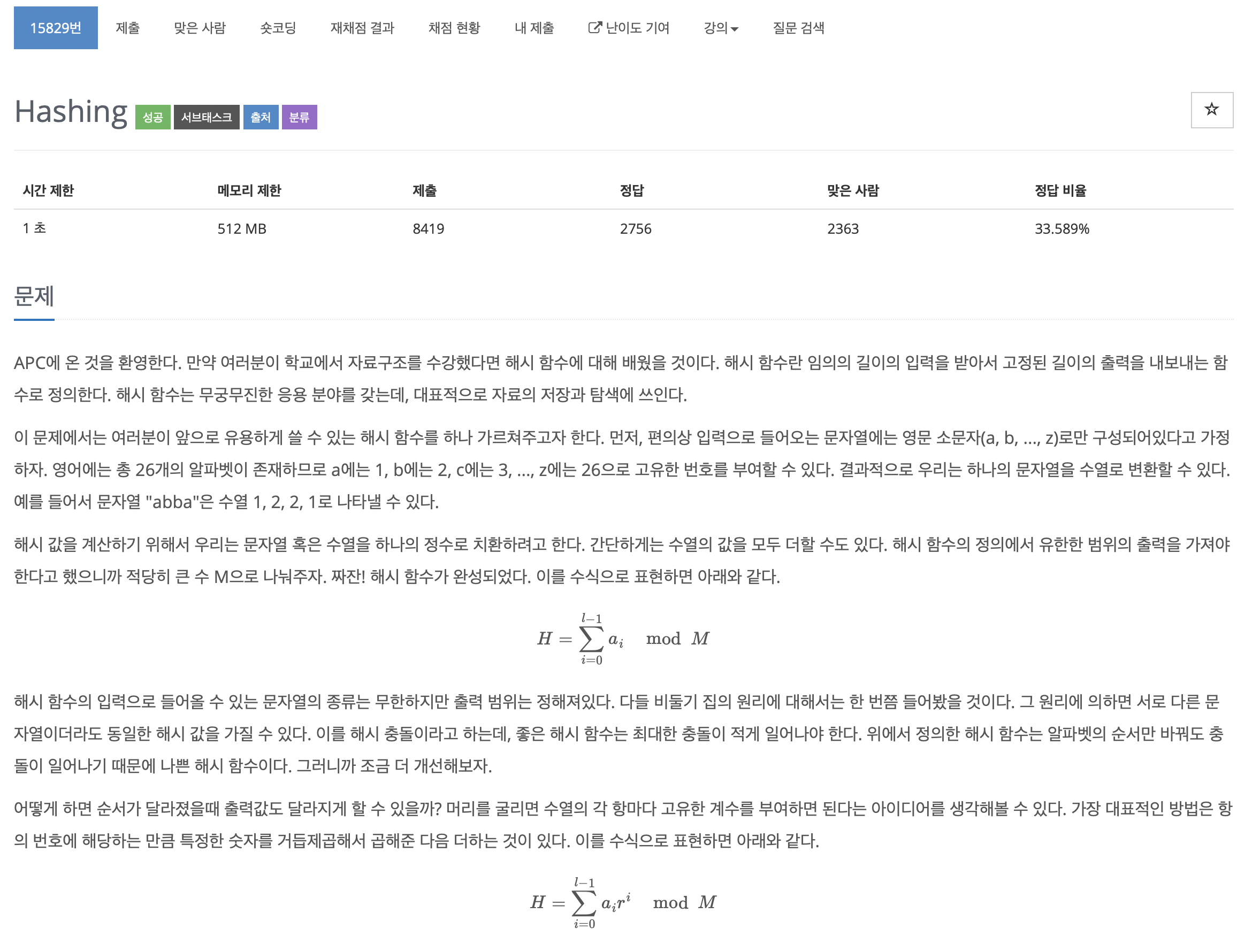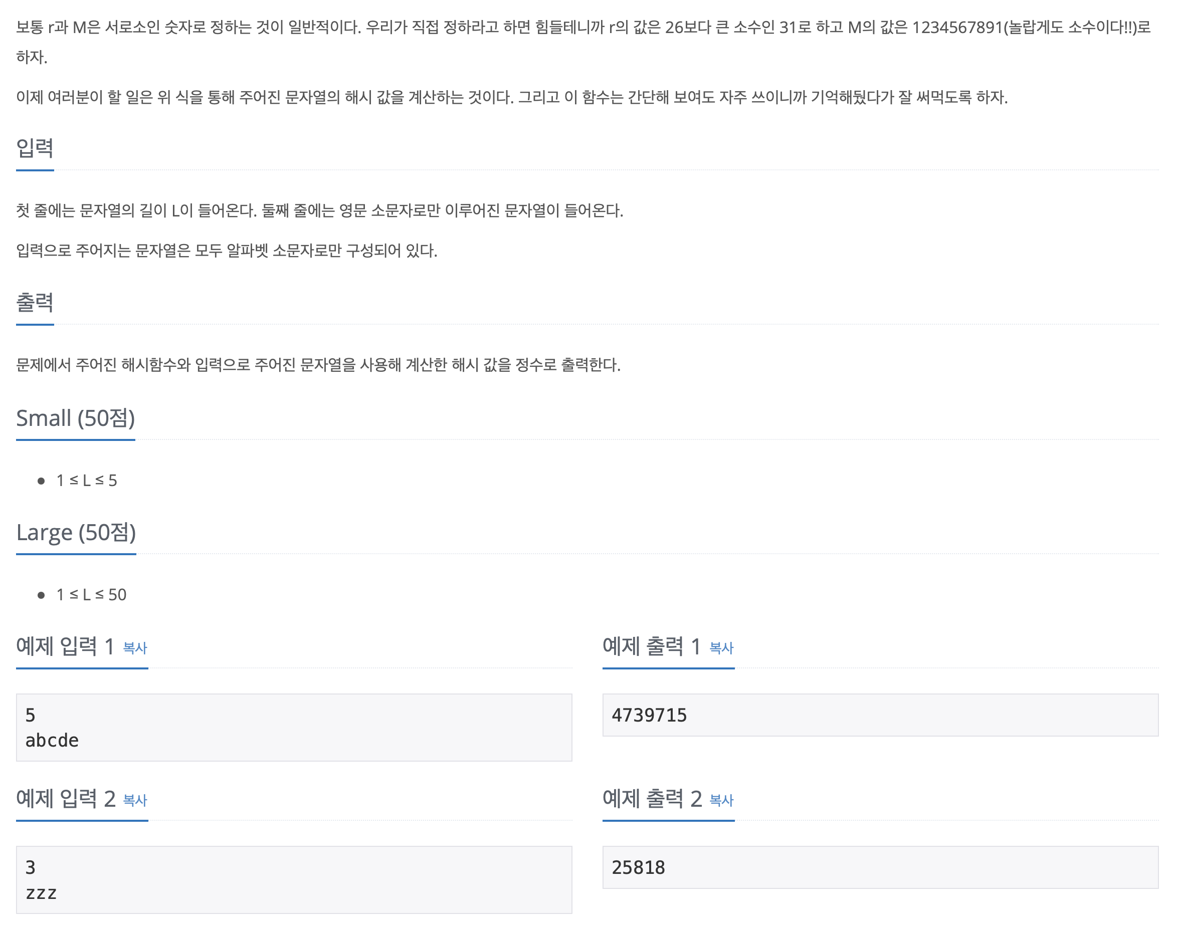 간단한 문제이다. 알파벳을 1부터 26의 숫자로 치환해주고, 그것을 특정 상수 r과 곱해준다. 이 때 이 상수는 문자열의 문자 위치 값만큼 거듭제곱을 해준다.