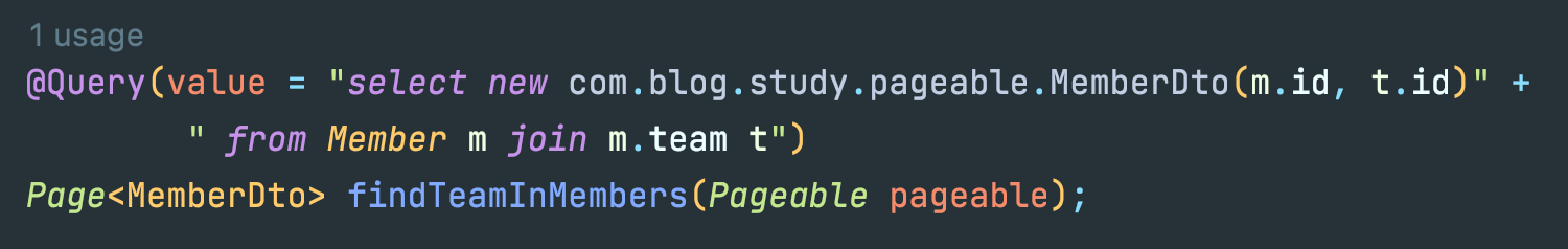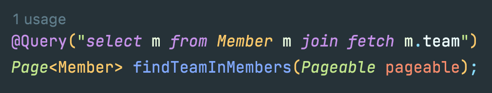 위 예제는 @EntityGraph로 탐색할 객체를 정했고, 실제 @Query에 작성된 JPQL을 SQL로 변환 하자면 select m from member m where m.id = id이기 때문에 카운트 쿼리도 이 JPQL을 사용하여 select count(m) from member m where m.id = id로 만들어 졌다.