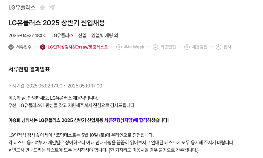 결국 결과는 불합격이었지만, 좋은 기업에 도전해보고 나의 부족함을 확인했다는 점에서 의미 있는 경험이었다.
