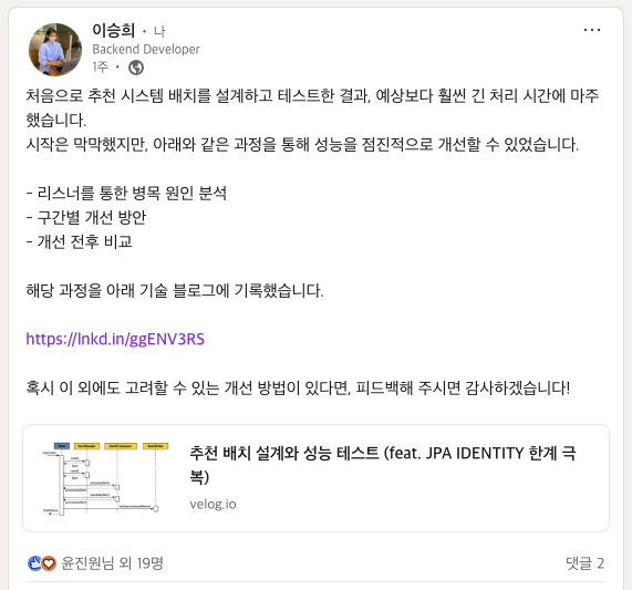 열심히 작성했던 블로그 글이 의외로 관심을 많이 받지 못해 아쉬워서, 첫 링크드인 업로드로 ‘배치 설계 관련 블로그 글’을 첨부해 올렸다. 예상보다 훨씬 많은 관심과 연결 요청이 와서 놀라기도 했고, ‘기록하고 공유하는 일’의 가치를 다시 느꼈다. 앞으로도 종종 기술적인 인사이트나 나만의 시행착오를 정리한 글을 꾸준히 올려보려고 한다.