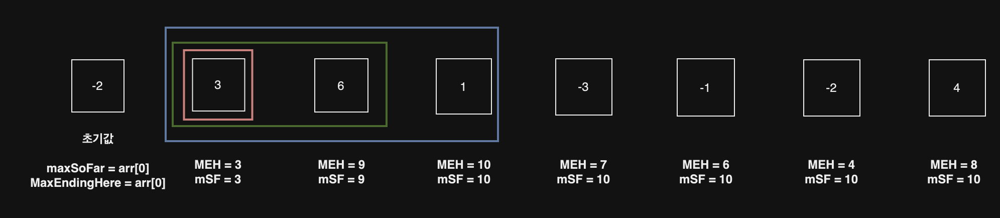변수 maxSoFar = arr[0], maxEndingHere = arr[0];