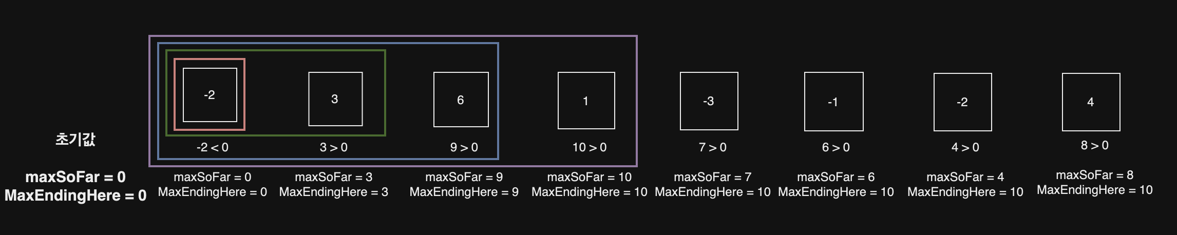 3. 만약 maxEndingHere가 음수이면 maxEndingHere = 0; (부분 배열을 새로 시작)