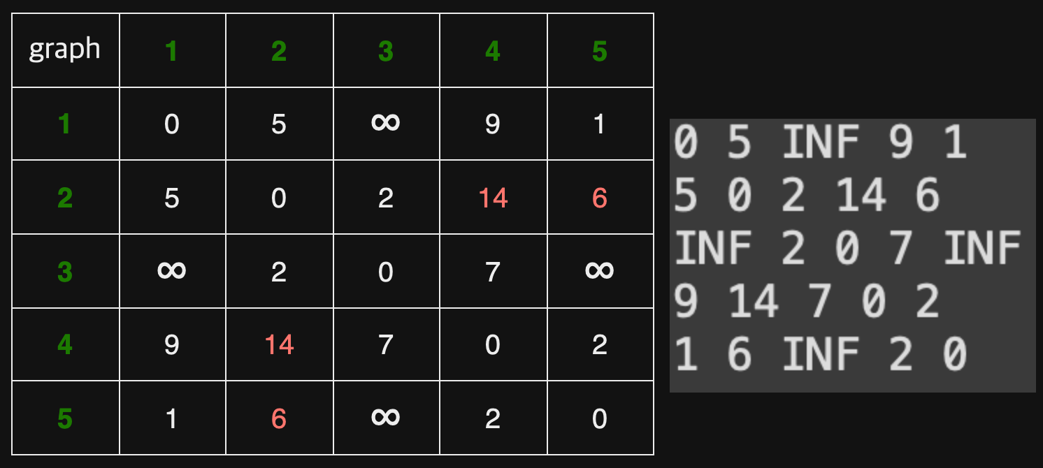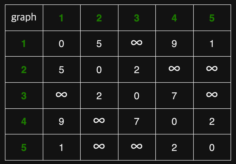 초기 그래프를 2차원 배열로 나타내면 다음과 같다. 여기서 해당 노드에서 특정 노드까지 가는 길이 없다면 ∞