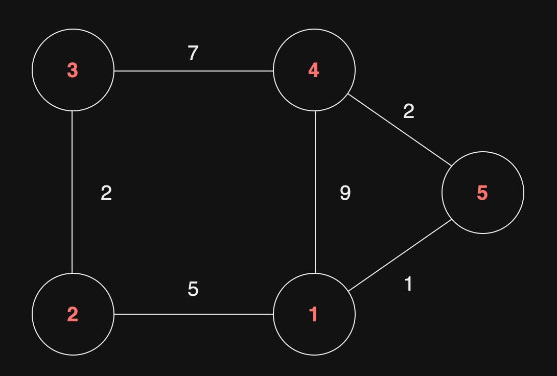 Node(4) ↔️ Node(2)는 현재 가중치 9로, 중간 노드(Node(5)