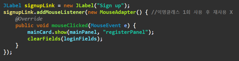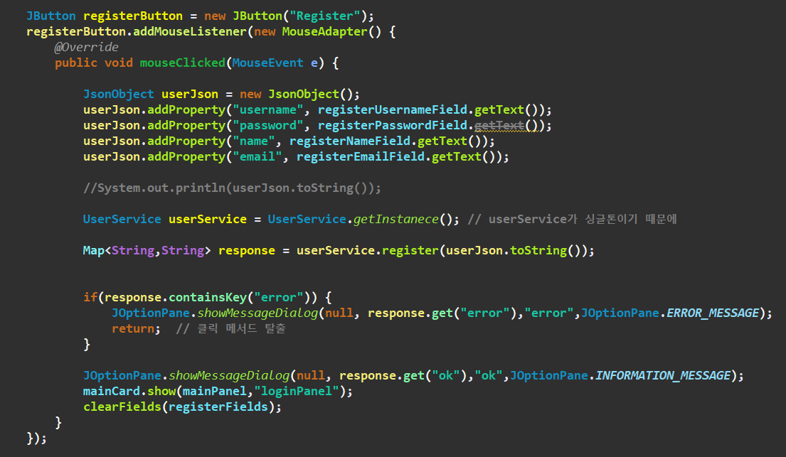"Register" ๋ฑ๋ก ๋ฒํผ์ ๋๋ฅด๋ฉด registerButton์ ๊ฐ์ฒด(์ธ์คํด์ค)๊ฐ ์์ฑ