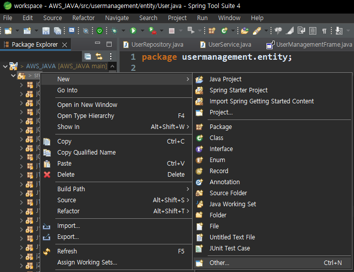 - entitiy(ํจํค์ง).User ๋ฉค๋ฒ๋ณ์๋ง ์ ์ธ๋ USer ํด๋์ค