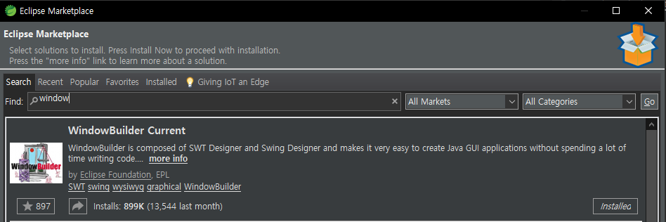 Spring Tool Suite 4 ์๋จ Help > Eclipse Maketplace > winodw ๊ฒ์