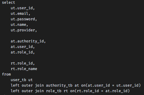 left outer join role_tb rt on(rt.role_id = at.role_id)