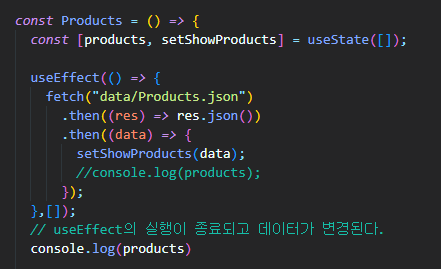 - useEeffect(()=>{},[products,count]) ==> component가 실행될때 처음 한번 실행된후 products와 count 중 하나라도 값이 바뀌면 useEffect가 실행됨
