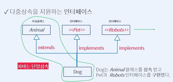 자바는 단일 상속만 지원하지만, 인터페이스는 여러 개를 구현해도 상관이 없기 때문에