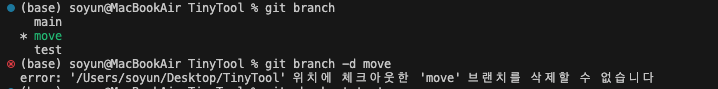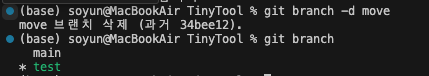우선 블로그를 쓰기위해 만든 move브랜치와 test브랜치 이두개를 각각 다른 방법으로 지워보도록 하겠다.