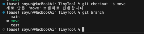 사실 git checkout -b move 도 사용할 수 있고 git cehckout -c move 이 두가지를 사용할 수 있다.
