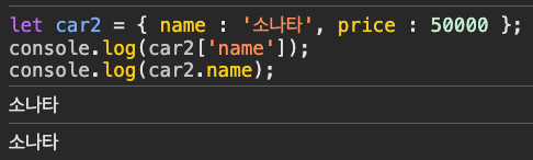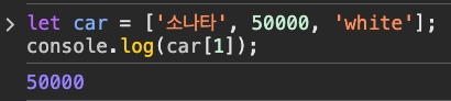 console.log(car2.price[0]) 이렇게 했더니 50000 잘 출력되는 것을 볼 수 있다.