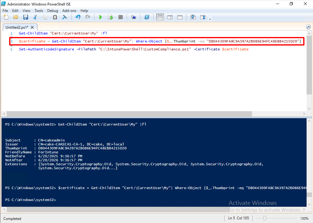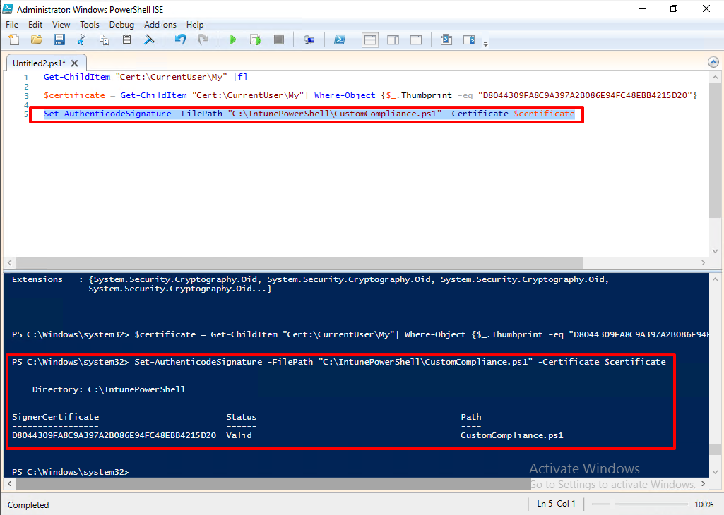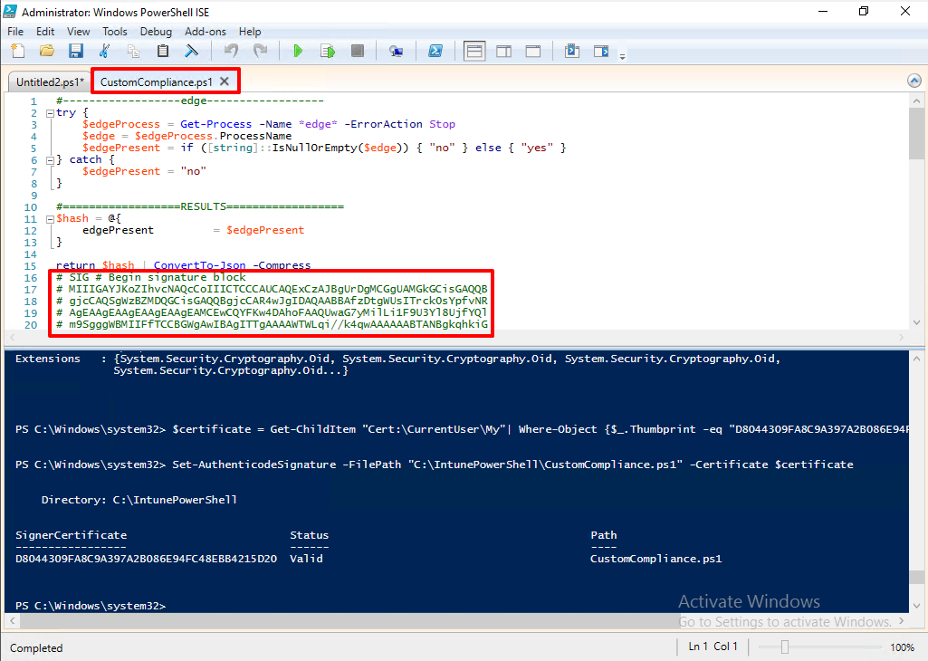 Set-AuthenticodeSignature -FilePath "C:\IntunePowerShell\CustomCompliance.ps1 -Certificate $certificate