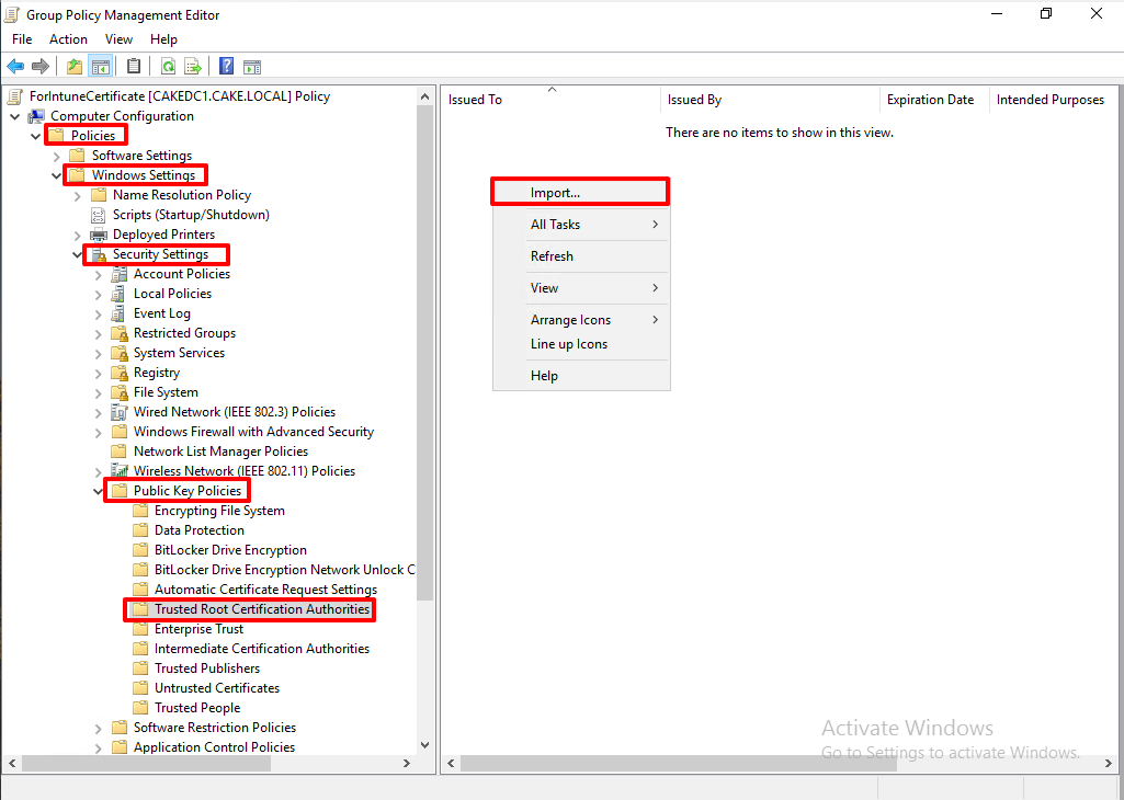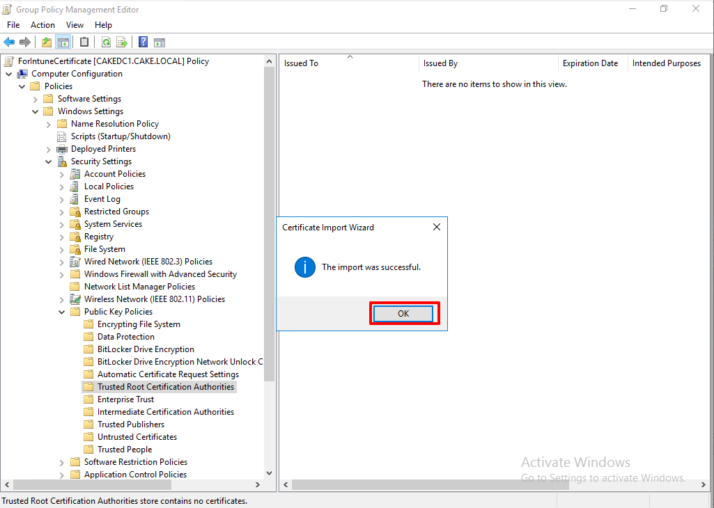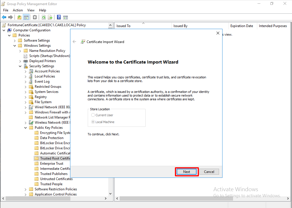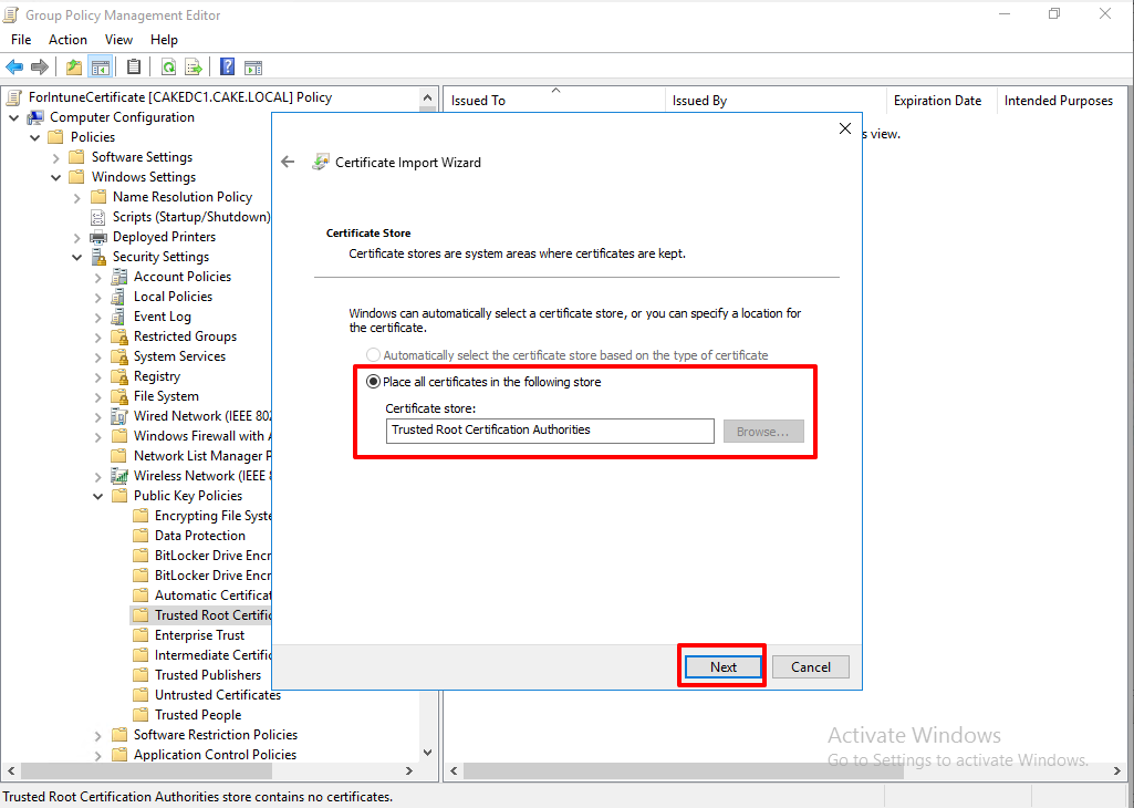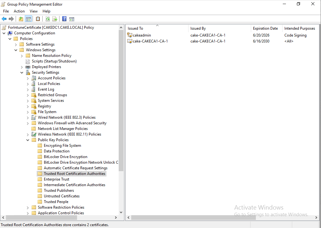 Moving on one of the domain joined devices. Run cmd as administrator and execute the command 'gpupdate /force' or you can take some time, the certificate will be installed automatically.