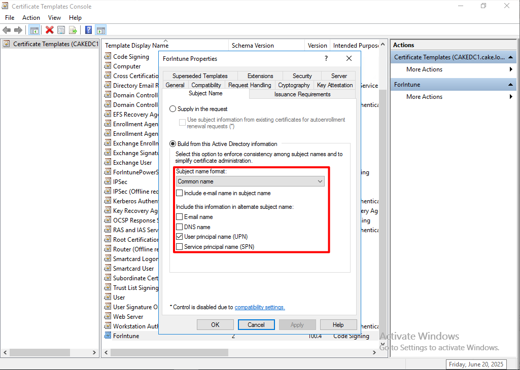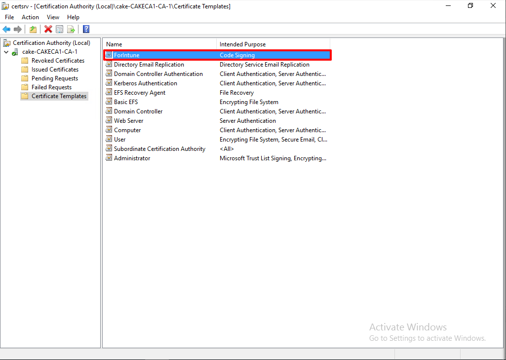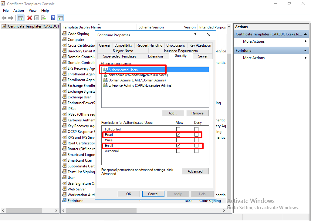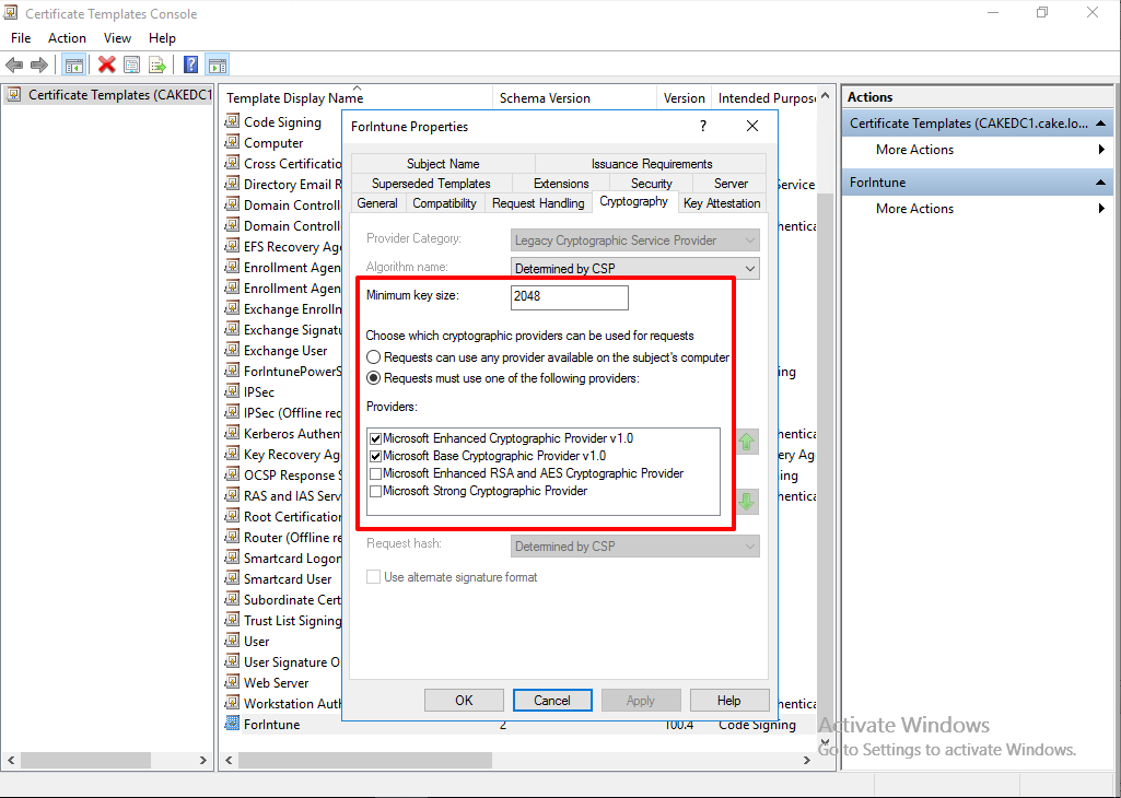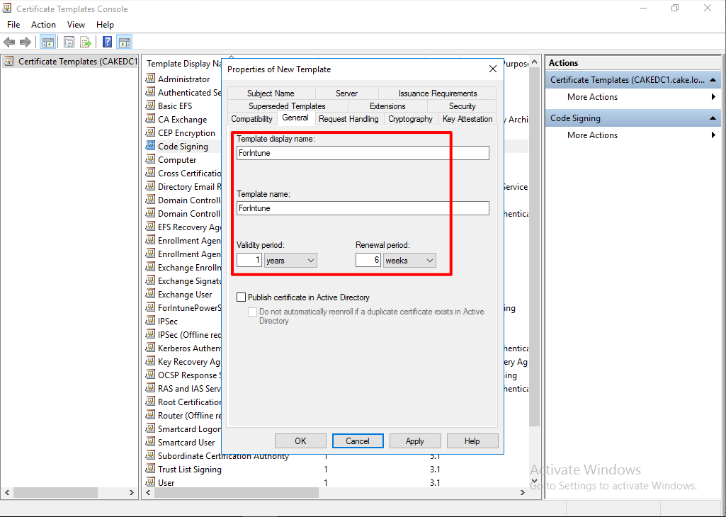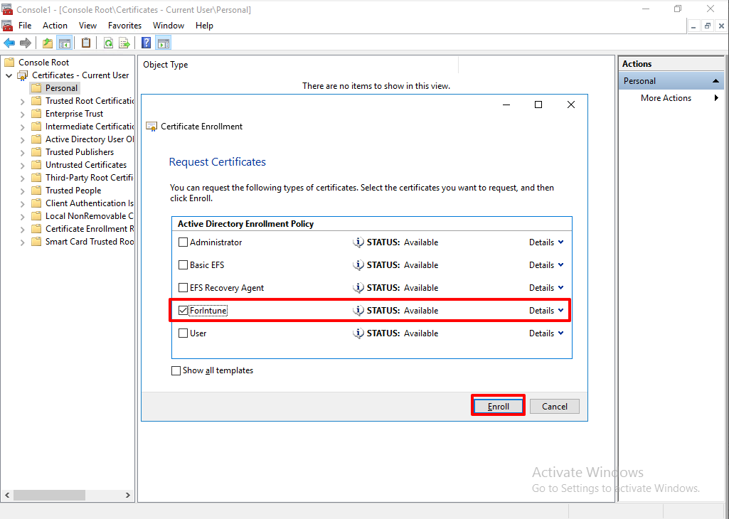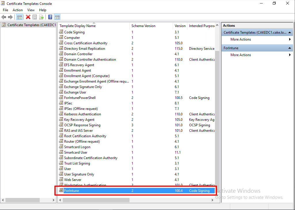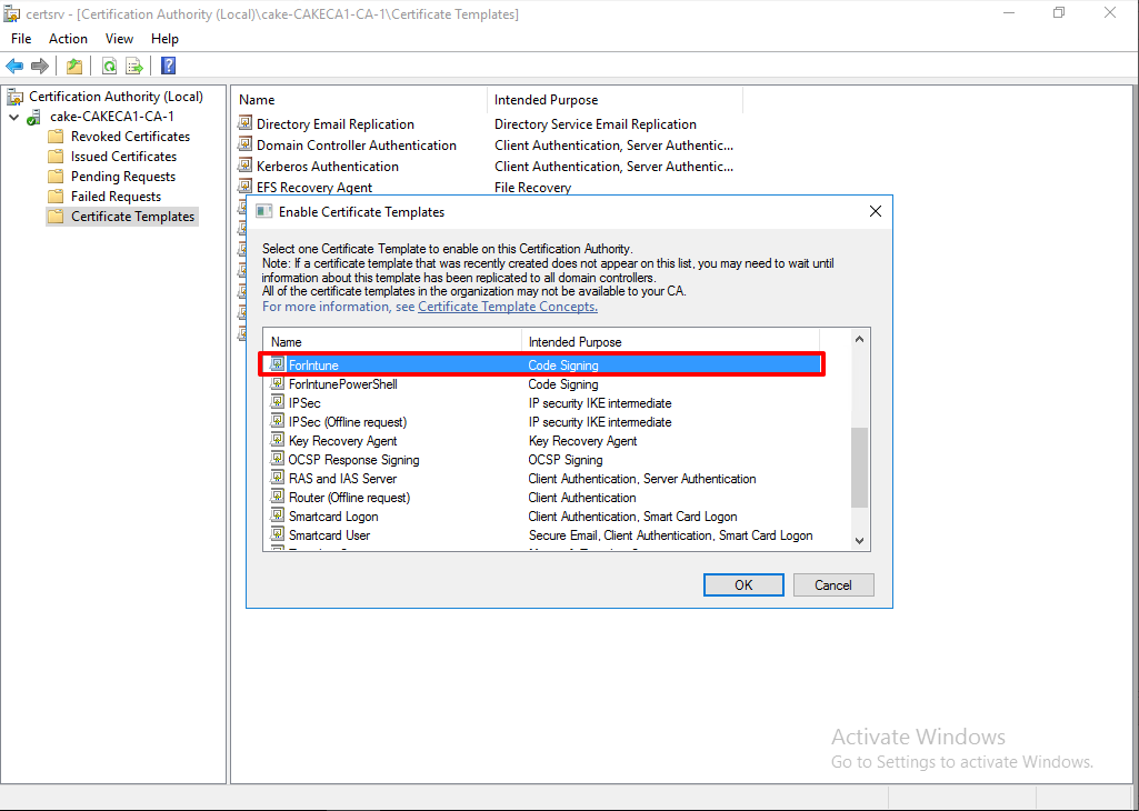 Find the 'ForIntune' from the list and click 'OK' to add the Certificate Templates.