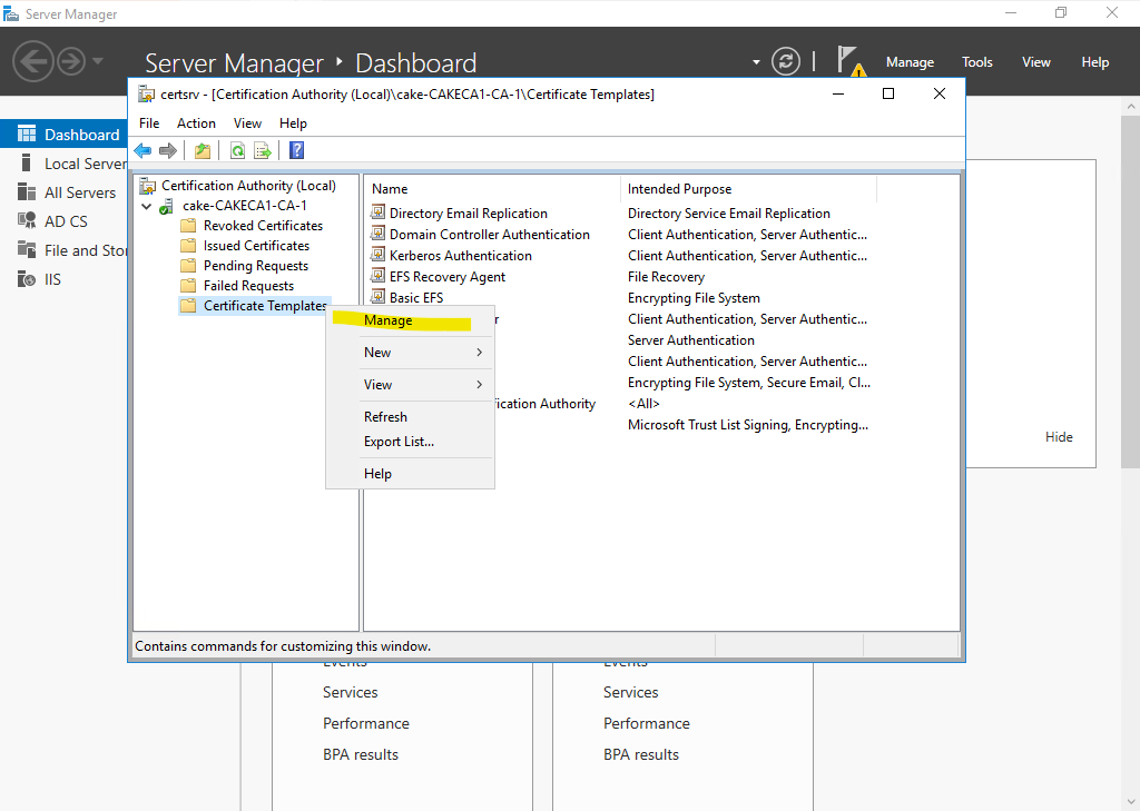 Go Certificate Template > Manage under the CN of the CA drop down list.