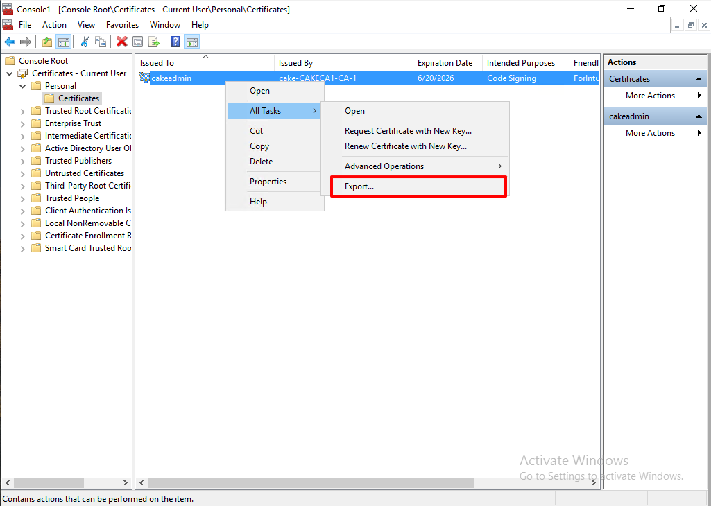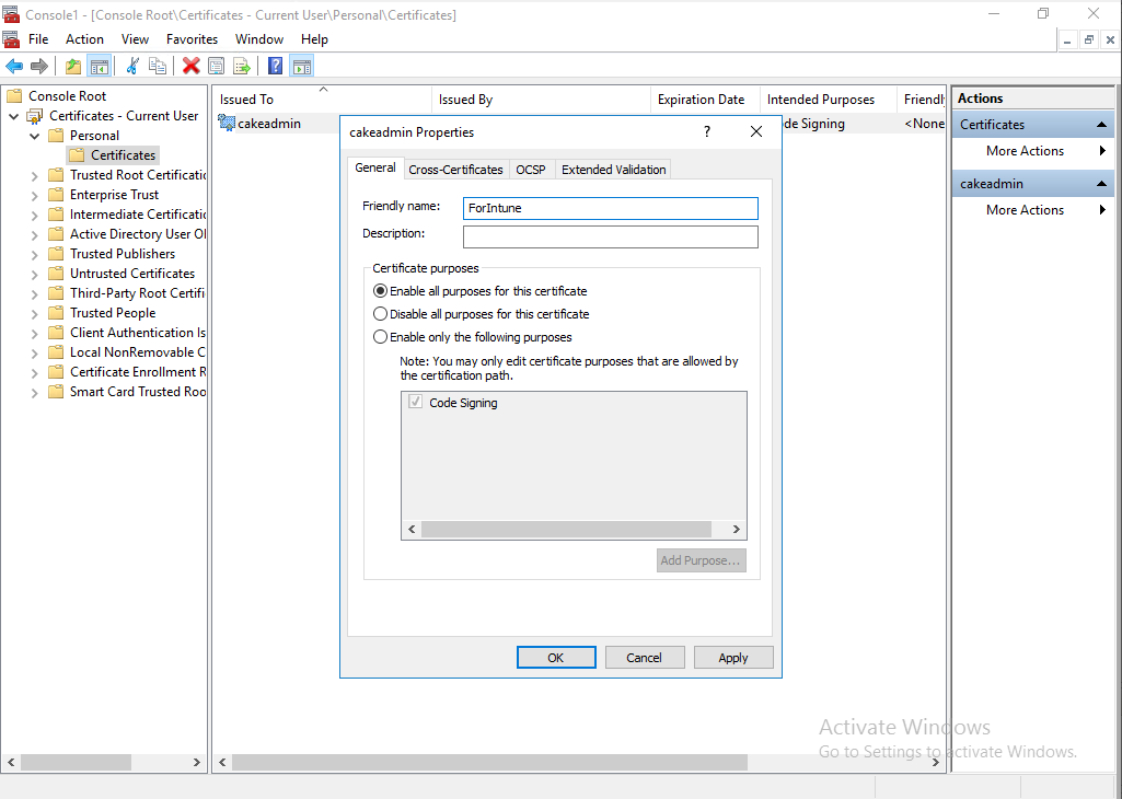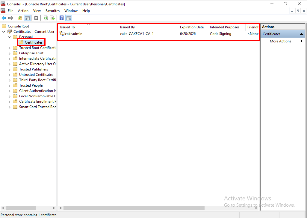 So, we got a new directory under the 'Personal' and the Cod Signing certificate as well.