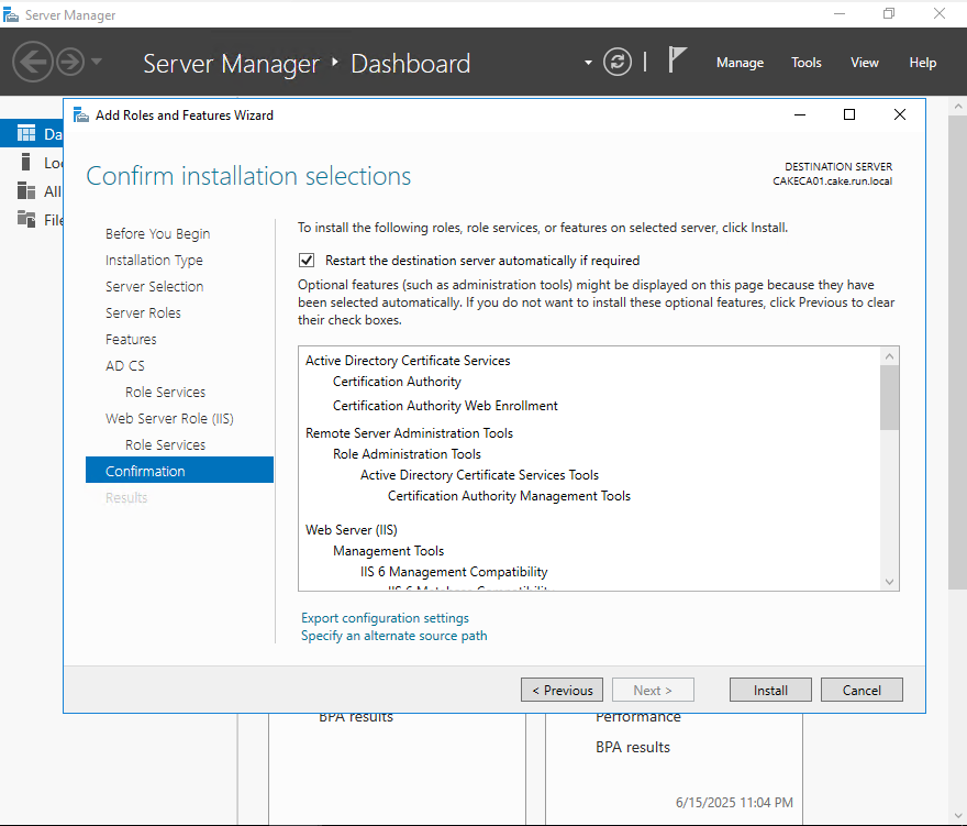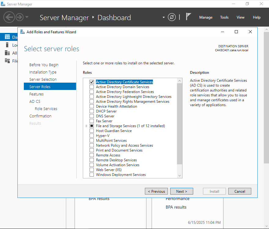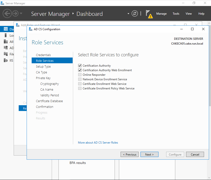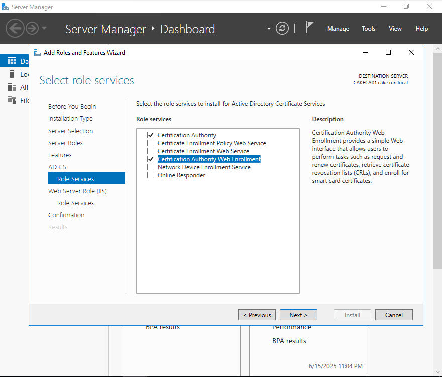 Check 'Certificate Authority' and 'Certification Authority Web Enrollment'