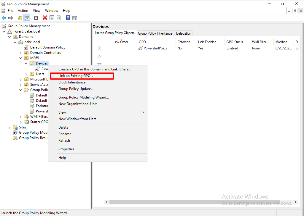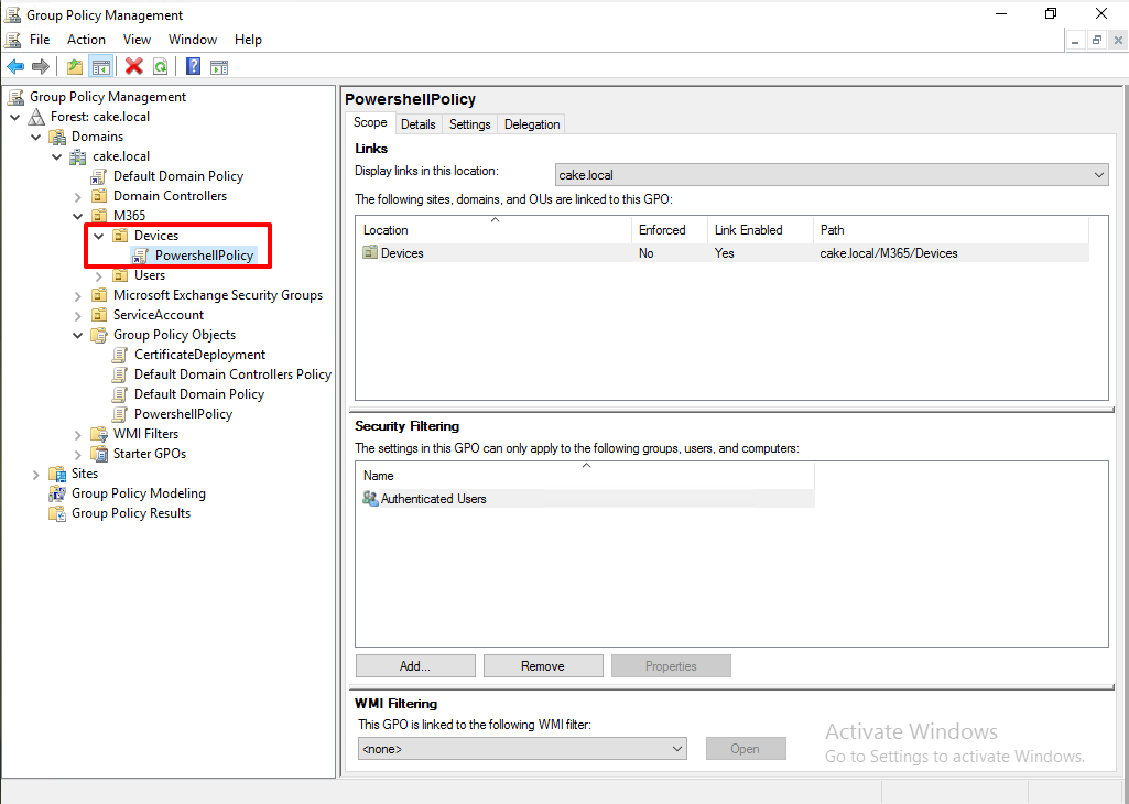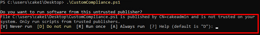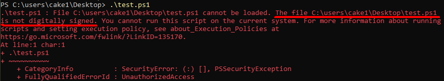 If I execute the test.ps1 in the AD joined device used user cake1, the execution is blocked.