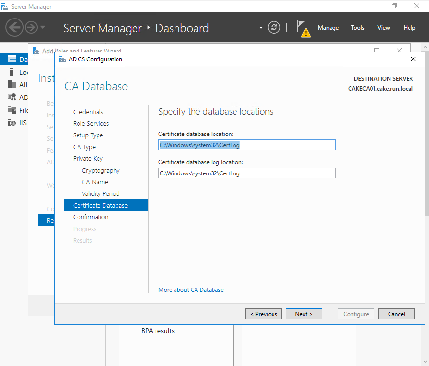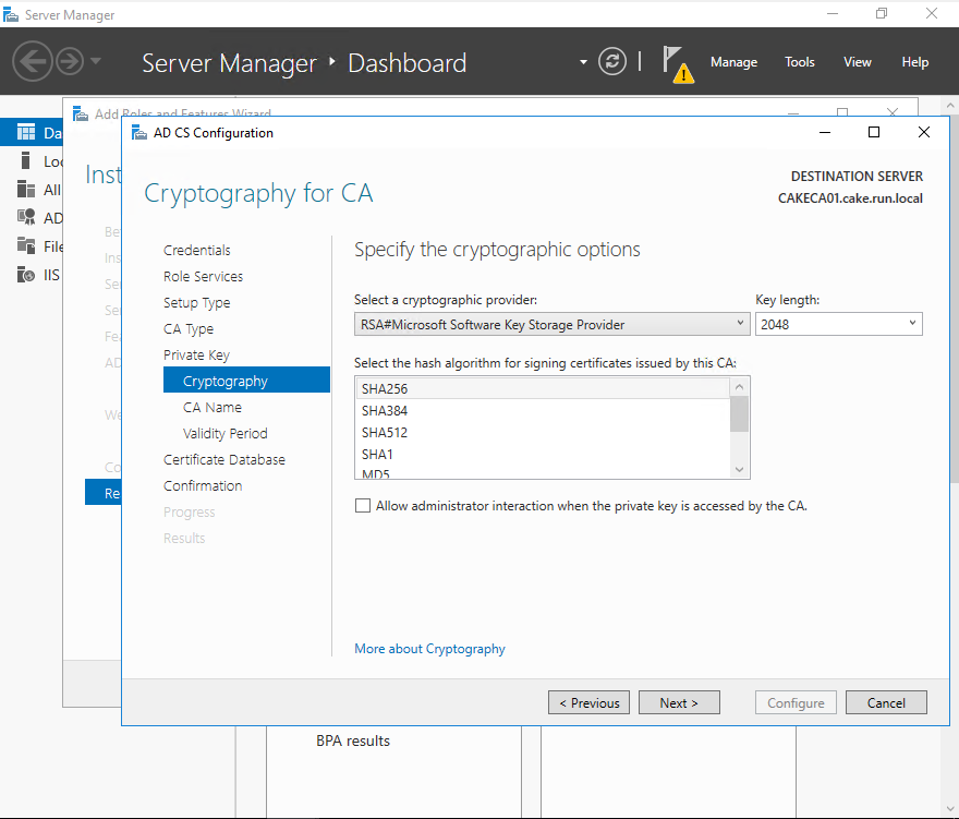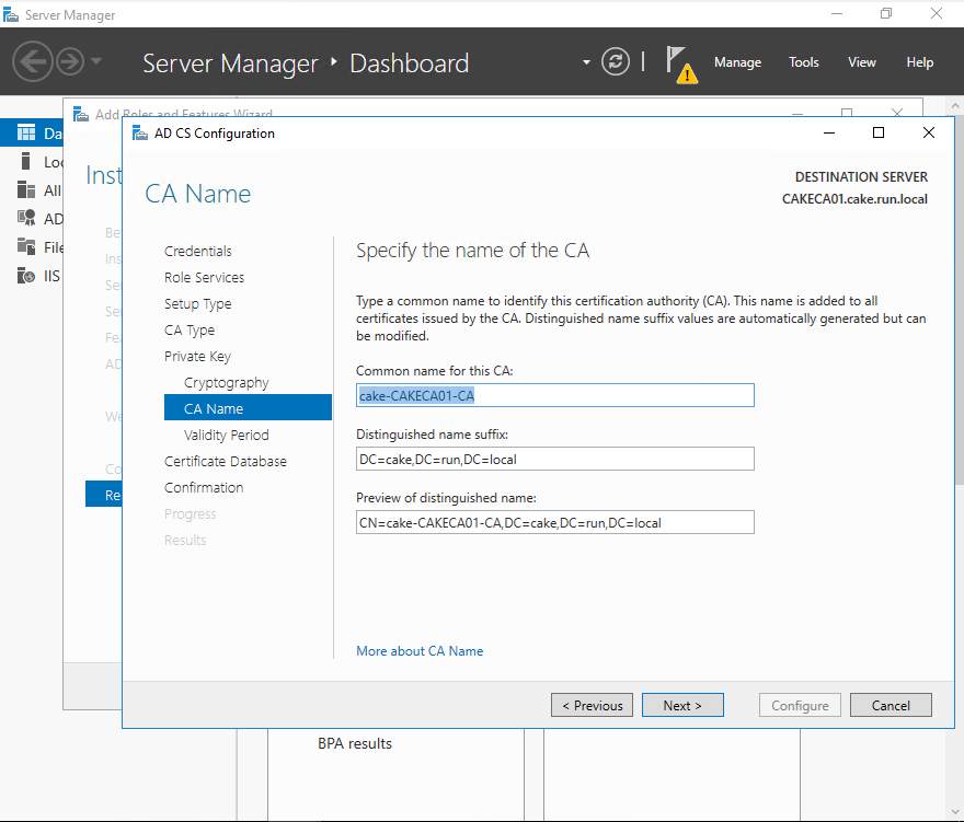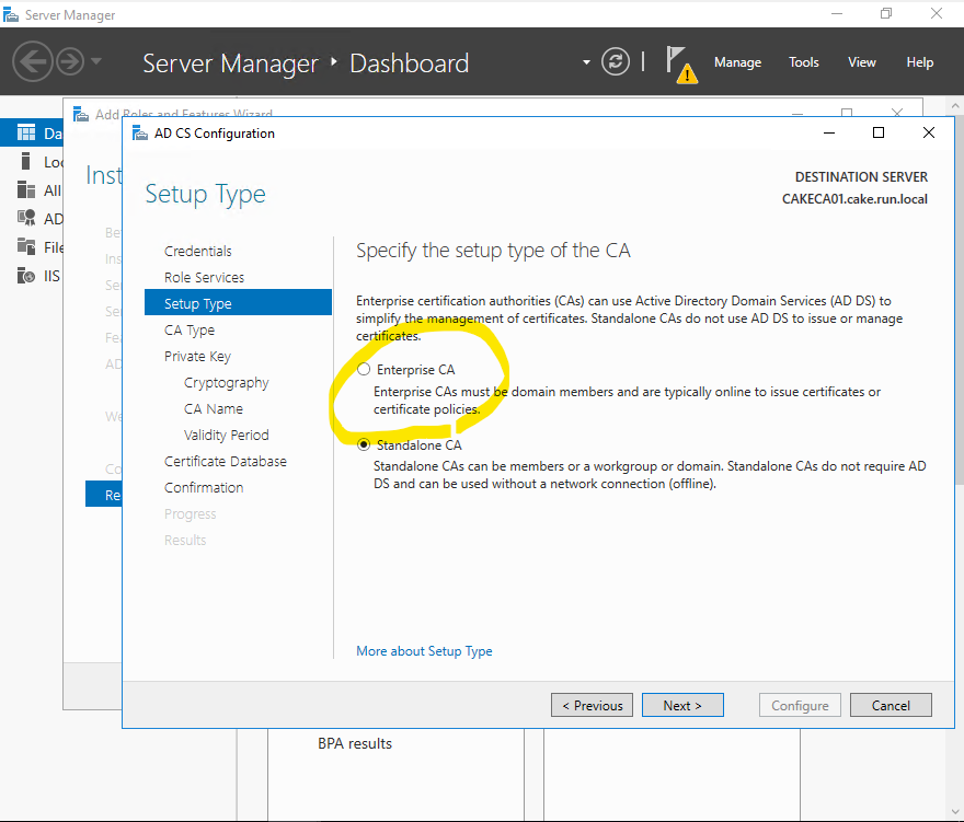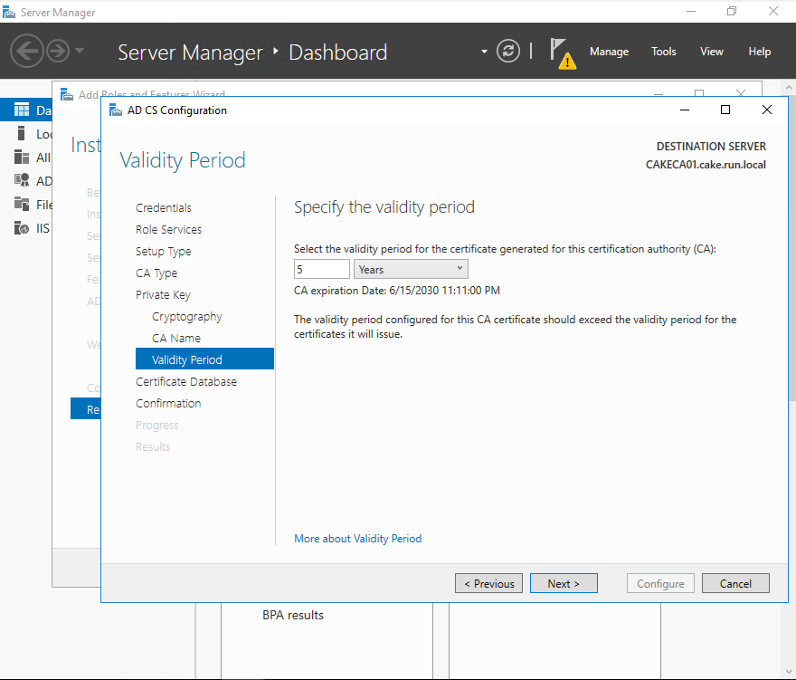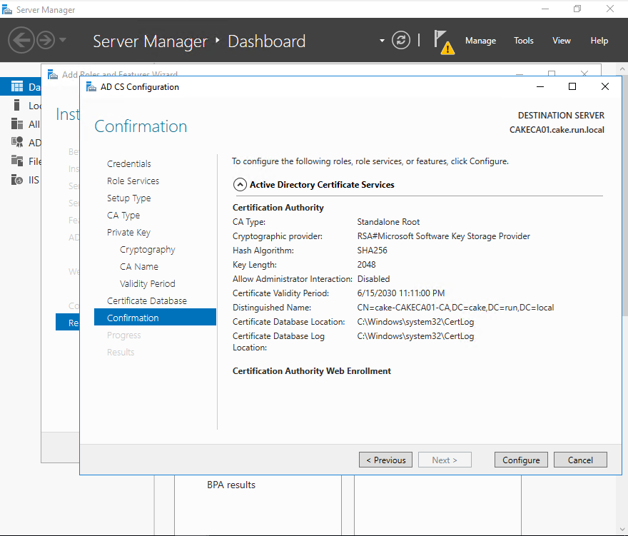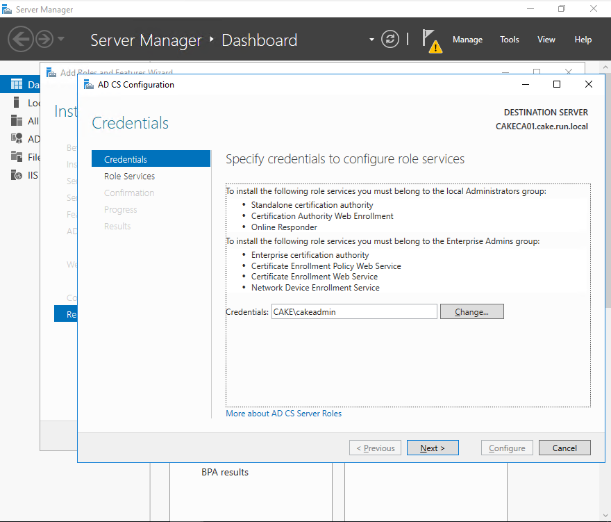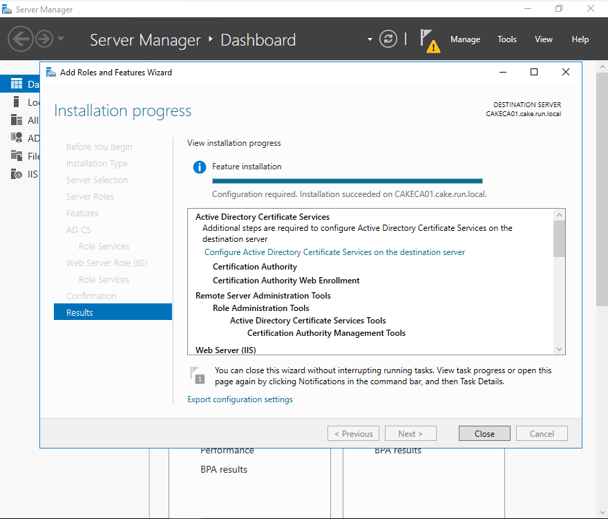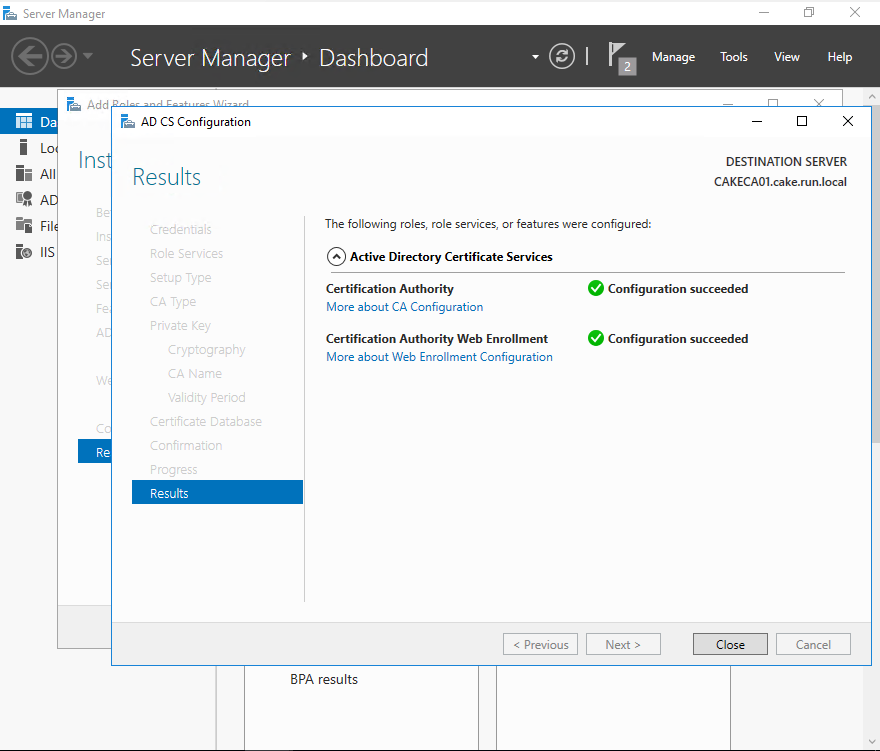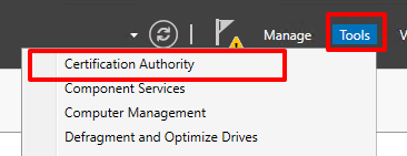 Once the installation has finished successfully, go servermanager > Tools > Certificate Authority.