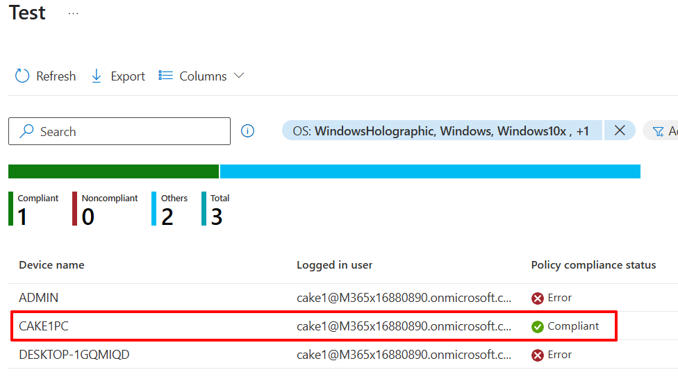 Here is the result. Only domain joined device which is CAKE1PC is marked as 'Compliant'.