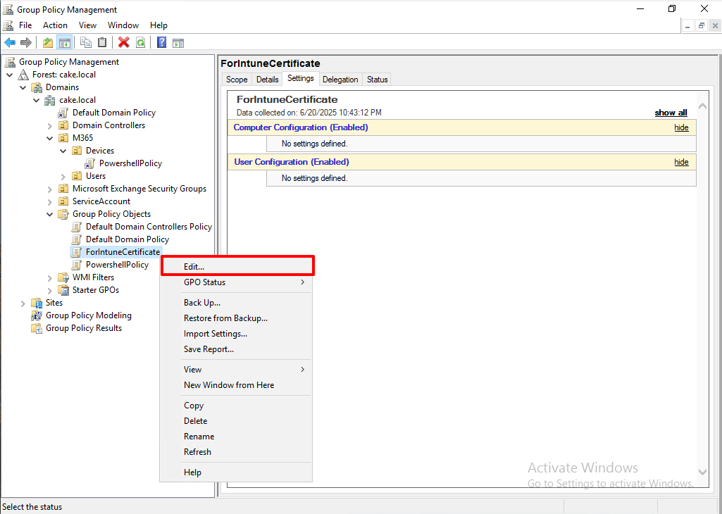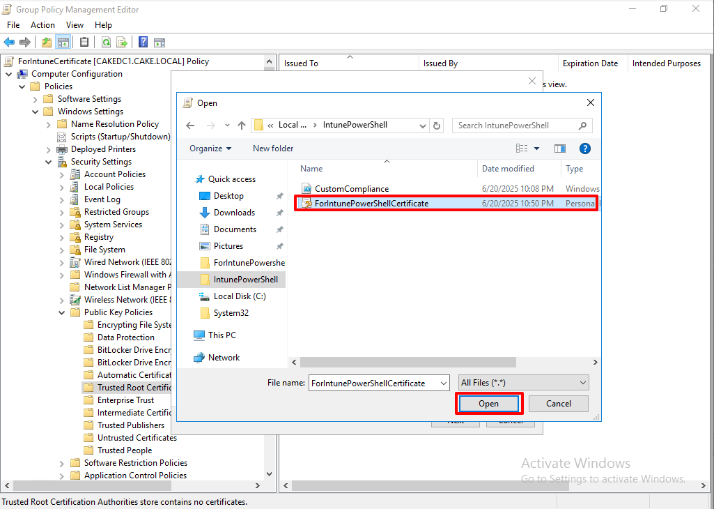 The script is signed but the device can't identify the signature in the script. This is why we have to install the certificate to the devices. From intune, we selected that we will run the script as a system context which means automatically executed without any prompt. Let's deployment the certificate from AD GPO.