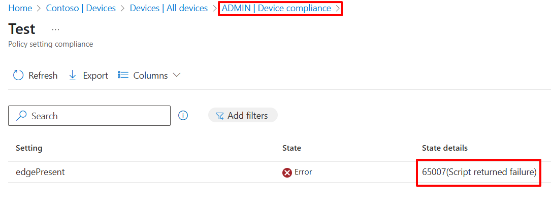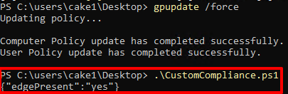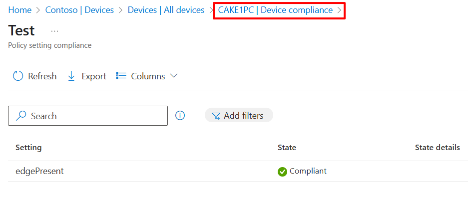 Let's check in azure portal. The CAKE1PC is Compliant which means the signed intune script is well executed.
