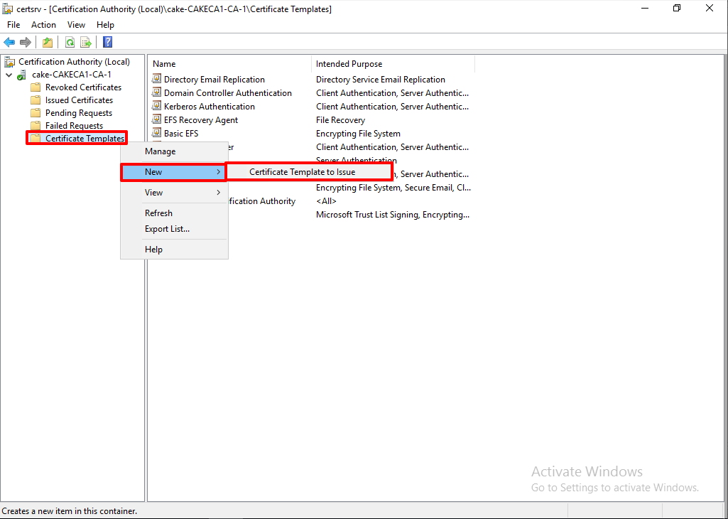 Go Certificate Template > (Right Click) New > Certificate Template to Issue.