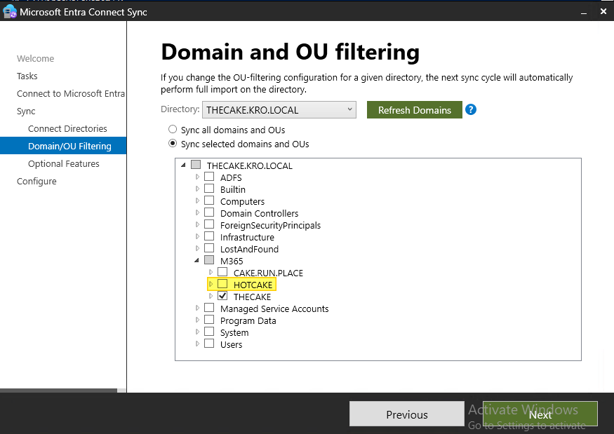 The users whose upn suffix is thecake.kro.kr and hotcake.kro.kr is in the DC(the cake.kro.local). And I synced @thecake.kro.kr users with ADFS authentication in AADC.