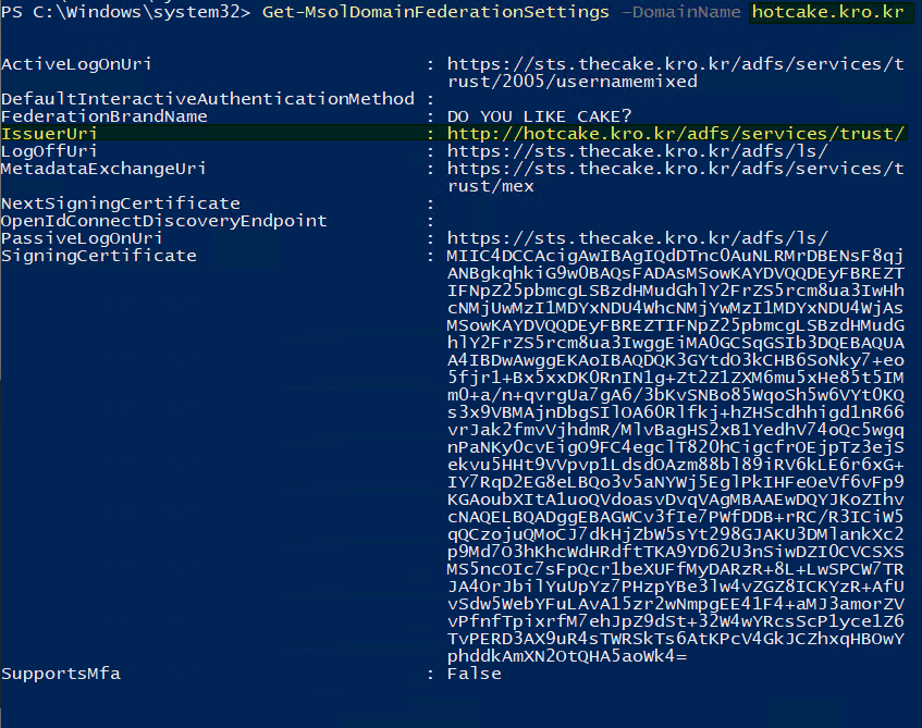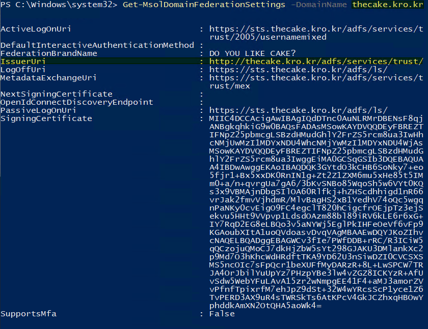 Get-MsolDomainFederationSettings -DomainName thecake.kro.kr'