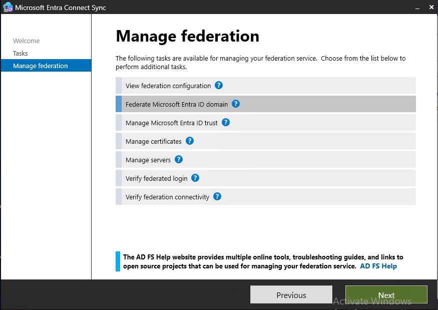 Now, select your new domain that will be federated. If the domain is not visible, you should go tenant and make your new domain verified.