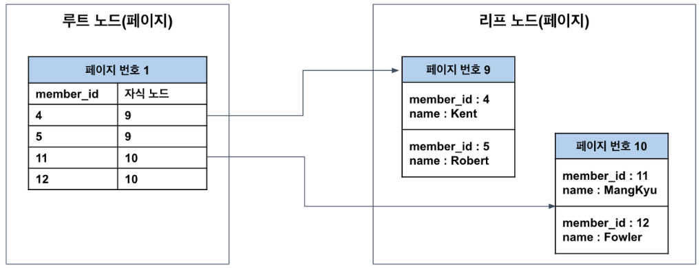 - 노드는 최상단에 있는 루트노드, (브랜치 노드), 리프 노드로 구성 되며 MySQL 에서는 이 노드를 페이지라고 합니다.