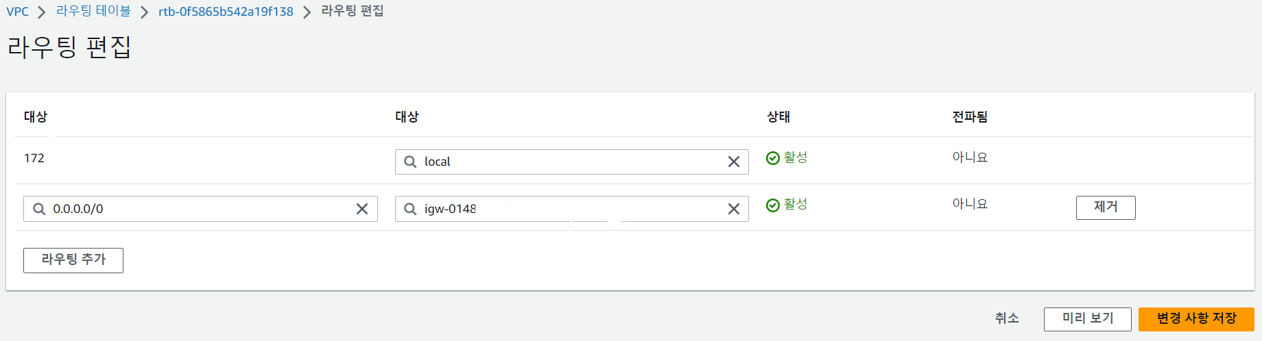 위 사진처럼, RDS 인스턴스에서 사용하는 서브넷과 관련한 라우팅 테이블을에 0.0.0.0/0, 인터넷 게이트웨이를 추가해준다.