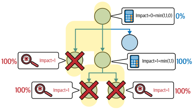 위의 그래프는 중복 의존성을 갖는다. 최하단의 노드 모두에서 failure가 떴고, 이로 인해 상위 노드는 100%의 영향을 받게 된다. 상위 노드의 형제 노드 중 하나도 똑같이 failure가 뜬 상황이다. 하지만 나머지 한 개의 노드에서 failure가 뜨지 않은 상태이므로 영향력의 최소값만 택하는 최상단 노드에서는 0의 영향을 받게 된다. 즉, 대부분의 시스템 노드에서 failure가 발생했지만, 남아있는 한 개의 노드 덕분에 최상단의 노드마저 failure가 되는 일이 발생하지 않았다.