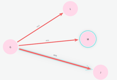 G 노드는 L, M, J노드와 AGG 모드 관계를 가지며, 이중 declared에 있 는 노드는 J뿐이다. 따라서, 나머지 L, M과 연결된 링크의 영향력에는 0이 곱해지고, J와 연결된 링크의 영향력 20에는 J의 비중인 0.33이 곱해져, 결과적으로 대략 6.6의 값을 가지게 된다.