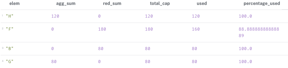 RETURN elem, agg_sum, red_sum, total_cap, used, used *100.0 / total_cap AS percentage_used