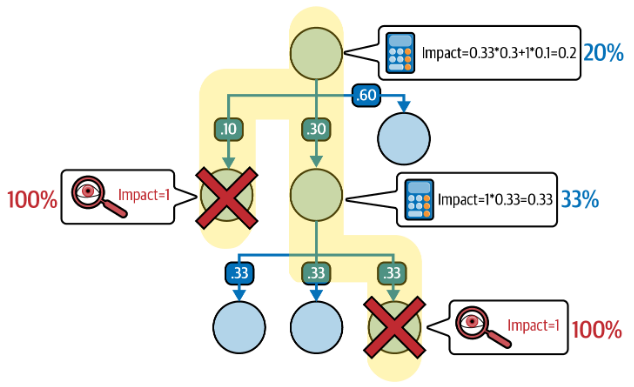 위 그림은 복합적 의존성을 갖는 그래프를 나타낸다. 돋보기는 실제 관측/발생한 영향도이고, 계산기는 계산되거나 도출된 영향도이다. 노란색으로 하이라이트 된 부분은 영향력의 전파 경로이다. 그림을 보면 알 수 있다시피, 최상단 노드는 최하단 노드로부터의 영향력이 가중되어 합하여지므로, 20%의 영향을 받을 수 밖에 없다. 만일 최상단의 노드가 의존하고 있는 노드로부터 어떠한 영향도 받지 않아야 한다면, 위와 같은 형태의 복합적 의존성 그래프는 적합하지 않을 것이다.