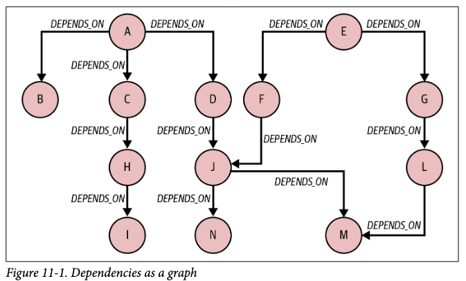 의존성 문제가 발생하는 상황을 생각해보자. 예를 들어, 어떤 프로그램을 개발할 때, 보안 취약성이 발견된 소프트웨어 라이브러리가 보고된다면 개발 중인 프로그램에서 해당 부분을 사용하는 곳을 찾고, 대체 시켜야 한다. 그렇지 않으면 나중에 그 부분에서 보안 문제가 발생할 것이기 때문이다. 이러한 상황을 그래프로 표현한다면, 프로그램 -[:의존하다]-> 라이브러리로 나타낼 수 있을 것이다. 이처럼 다른 요소에 의해 영향을 받는 네트워크 모형을 '의존성 모델' 이라고 한다. 앞선 사례와 같은, 의존성 모델에서 발생하는 문제는 그래프 패턴 매칭이나 그래프 알고리즘으로 풀어 나갈 수도 있다.