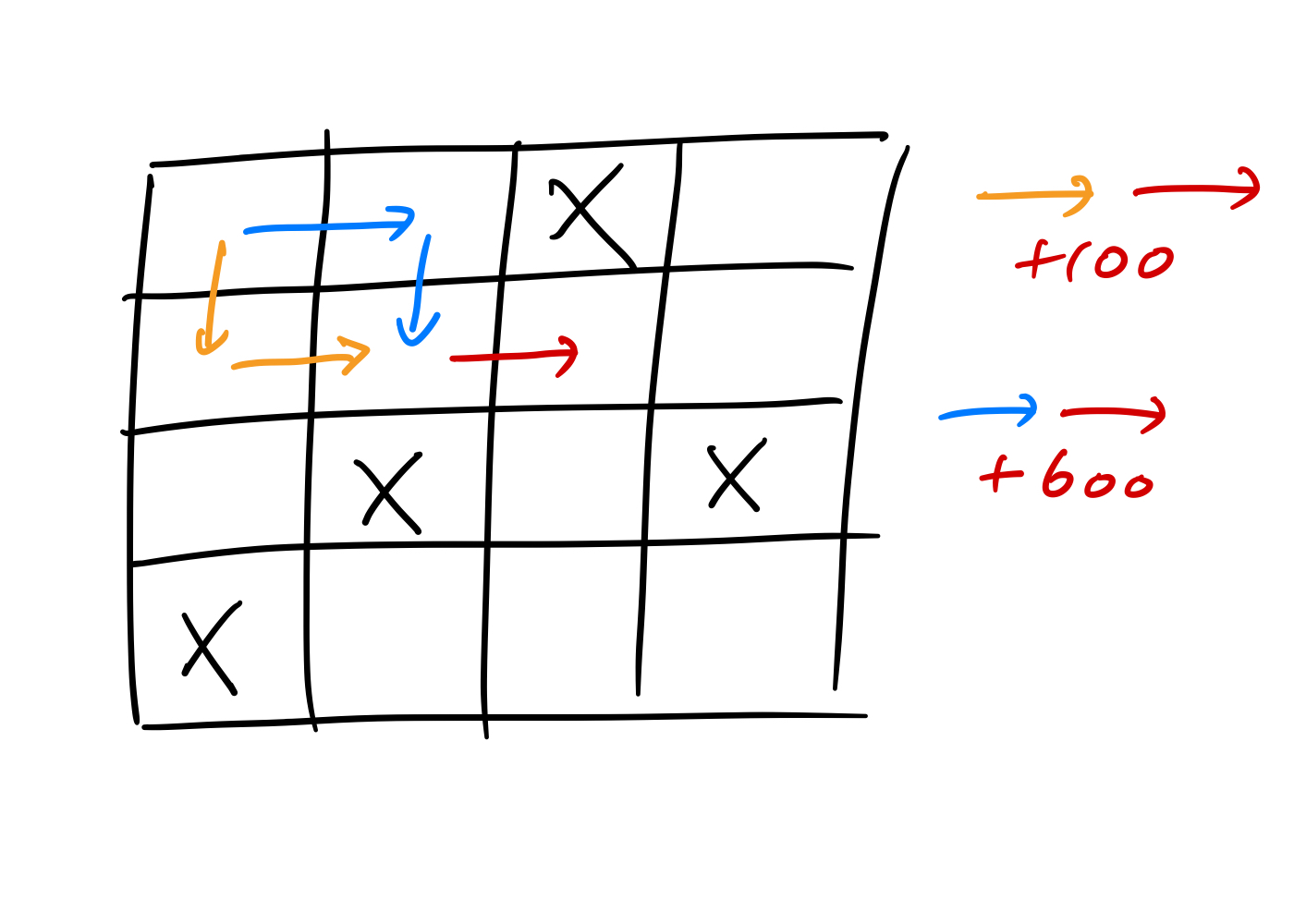 주황색은 같은 방향으로 직진이기 때문에 100원만 추가되지만 파란색은 코너이기 때문에 600원이 추가된다. 즉, 특정 위치에 도달했을 때의 비용 뿐 아니라 어떤 방향을 갖고 도달하게 되었는지를 기록해야 하는 것이다. 현재 예제에서는 (1, 1)에 같은 비용으로 도달했기 때문에 단순히 비용이 같거나 클 때에는 도달할 수 있도록 수정하는 걸로 고칠 수 있지만, 실제 테케 중에는 주황색이 더 많은 비용으로 도달하고 파란색이 더 적은 비용으로 도달해서 아예 주황색이 (1, 1)에 도달할 수 없게 될 수도있다.