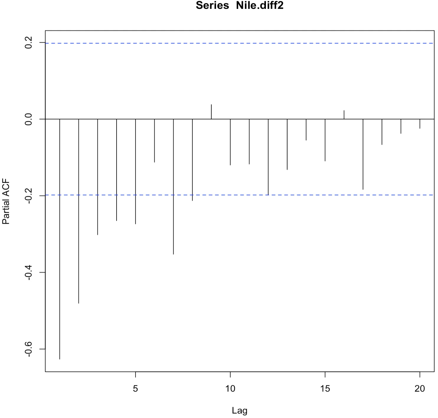 Partial autocorrelations of series ‘Nile.diff2’, by lag