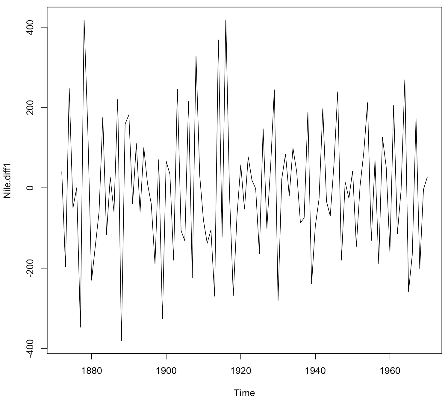 > Nile.diff1<-diff(Nile,differences=1)